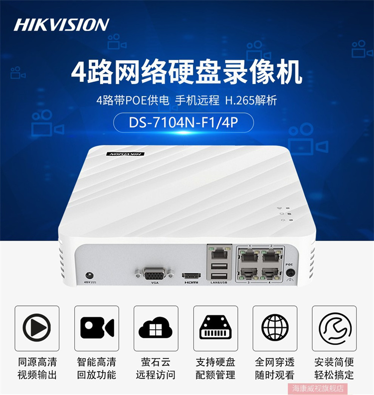 海康威视 DS-7104N-F1/4P 海康威视网络监控硬盘录像机4路POE网口 不带硬盘
