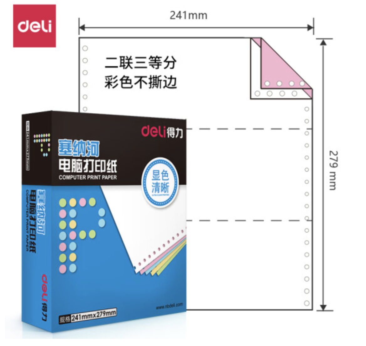 得力/deli N241-2 复印纸 塞纳河N241-2电脑打印纸 1000页/盒 二联三联四联彩色不撕边